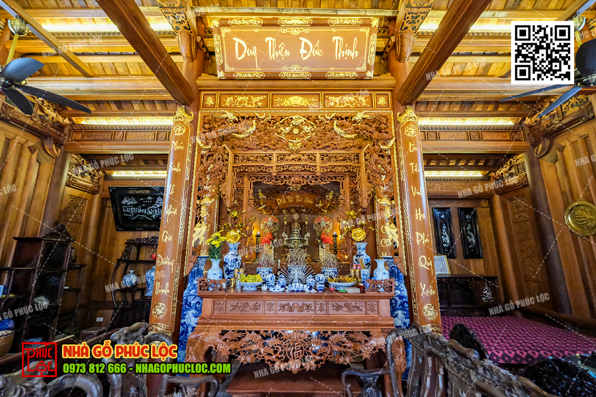 • Thiết kế phòng thờ trong không gian nhà gỗ 3 gian, 5 gian là nơi trang trọng nhất của ngôi nhà. Phòng thờ thường là gian giữa và có diện tích lớn hơn các gian còn lại.